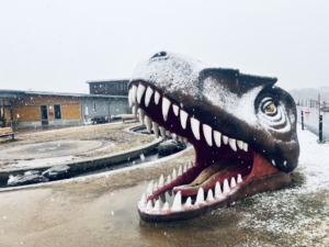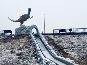大きな恐竜のすべり台や口を開けた恐竜も、雪化粧をするとどこか迫力とかわいらしさが一緒になった雰囲気に、、、。