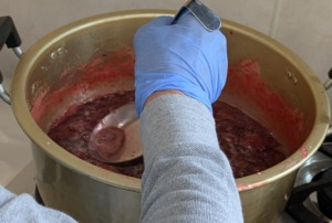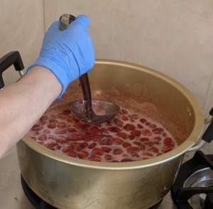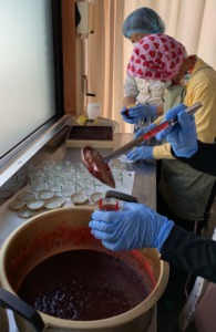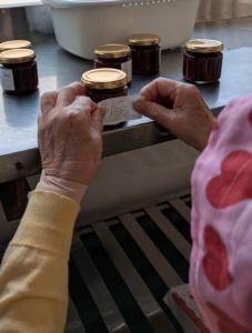 瓶を湯煎する人、鍋でジャムを煮詰める人、出来上がったジャムを瓶に詰める人、ラベルを貼る人。