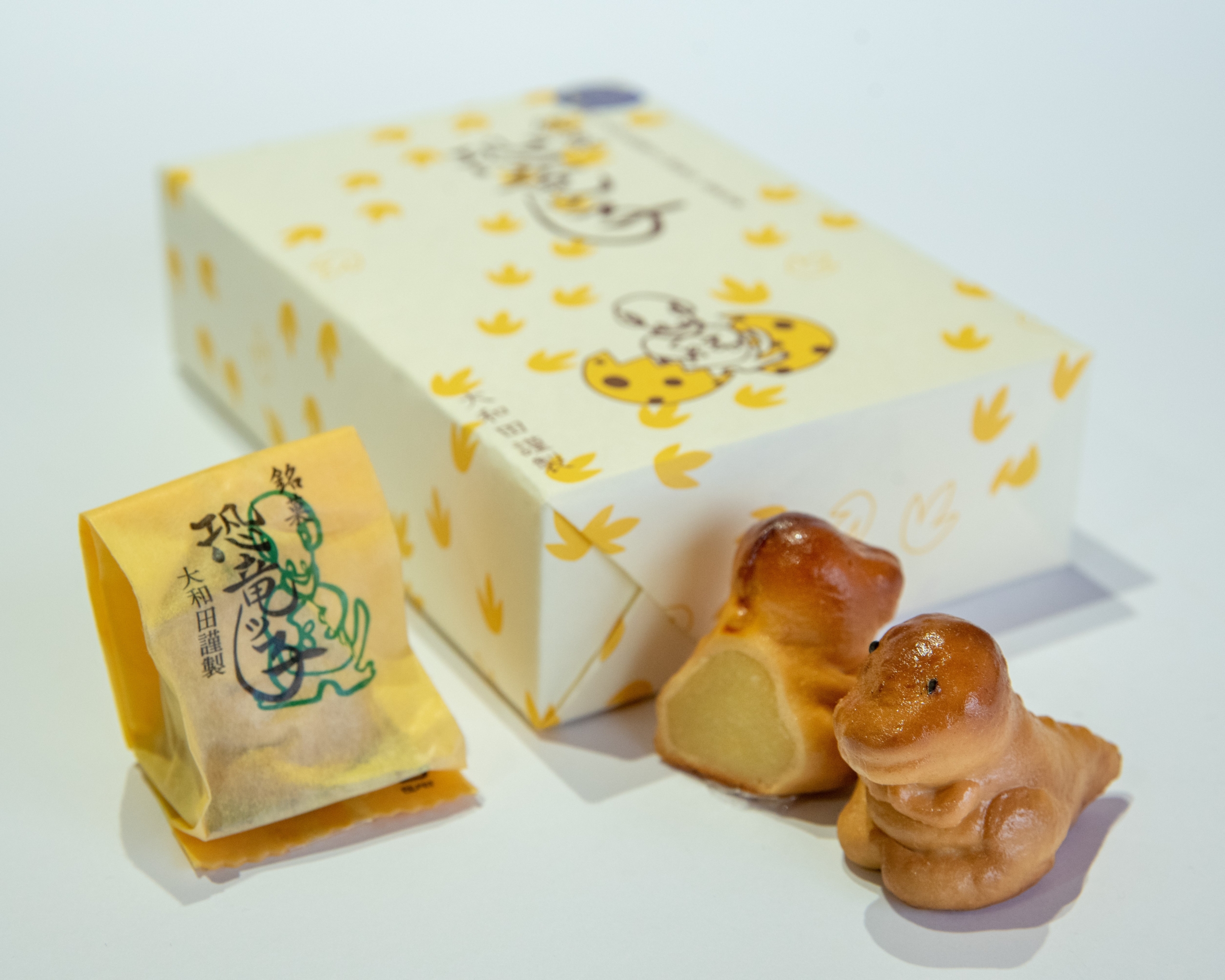6個入り 1,900円 8個入り 2,500円(税込み) 恐竜の形をしたココア生地に包まれた優しい甘さの白あんが、口の中いっぱいに広がります。